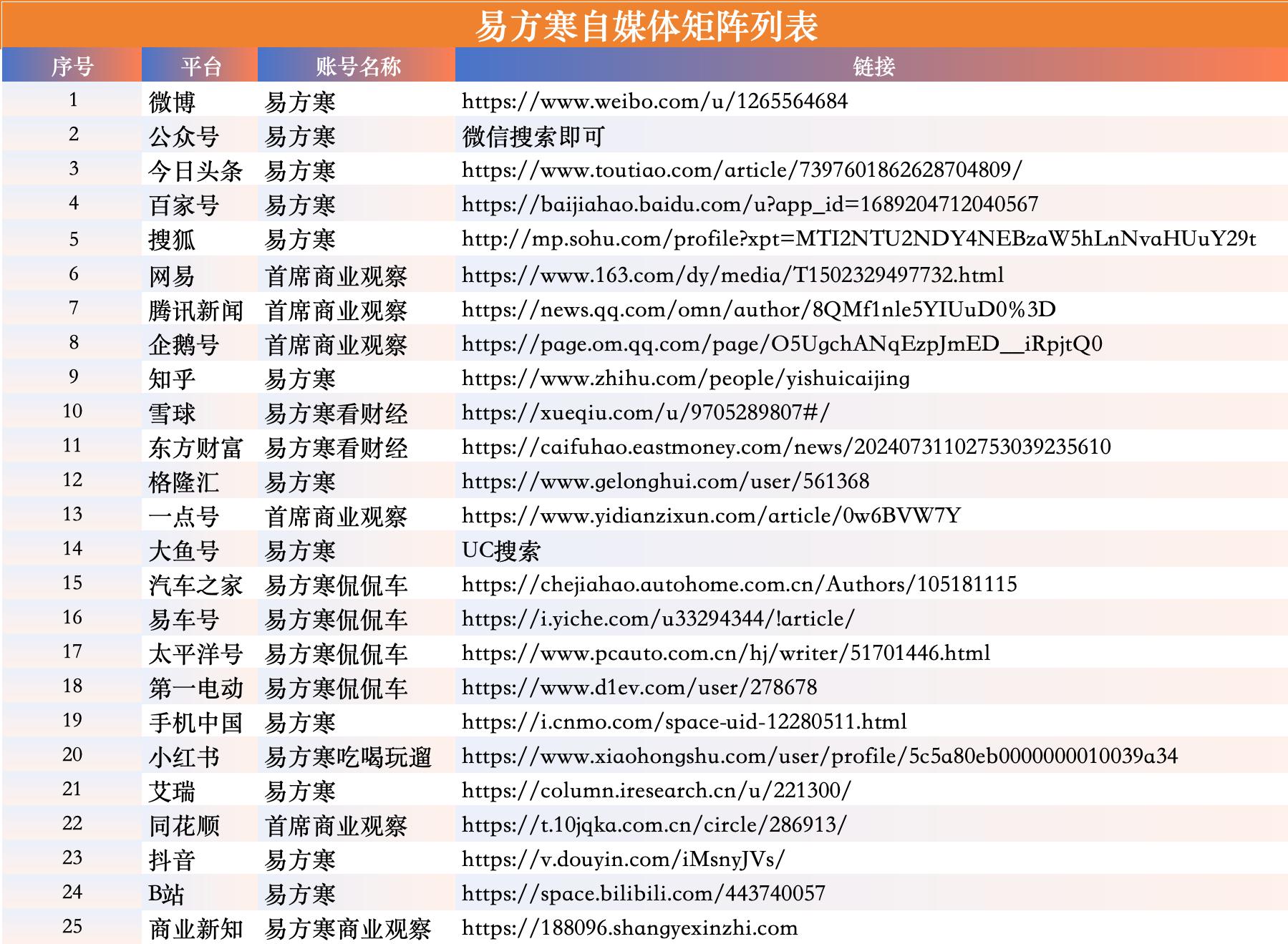 大家好,我是易方寒!致力科技互联网与新能源汽车观察解读。网易、新浪、搜狐、百度百家、今日头条号、钛媒体、雷锋网、汽车之家、易车等平台专栏作者。(联系我可在后台留言,或WX:YiFH2023)